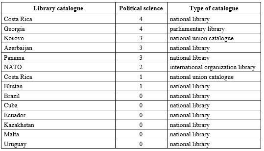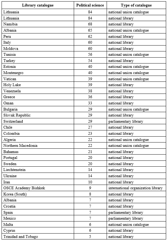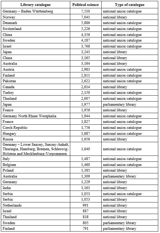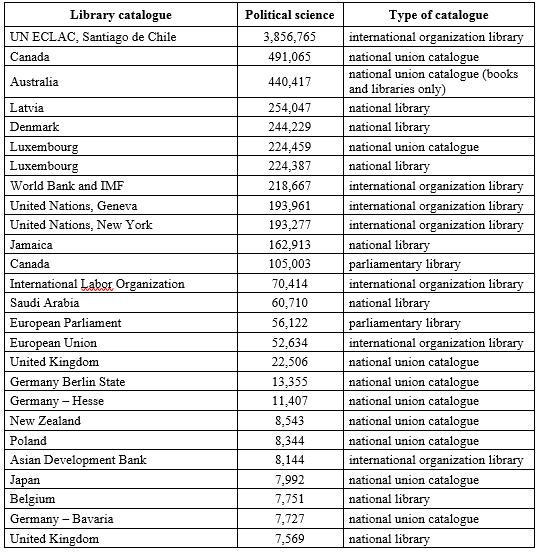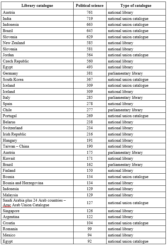 It would be erroneous to assume that the high concentration of global political science publishing and accessibility is not also reflected in the national union catalogues, national libraries, parliamentary libraries and international organization libraries.