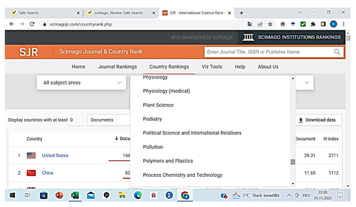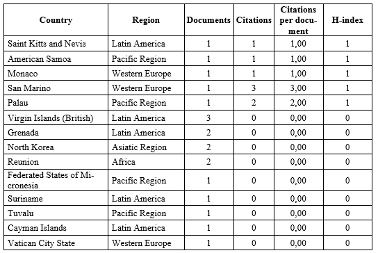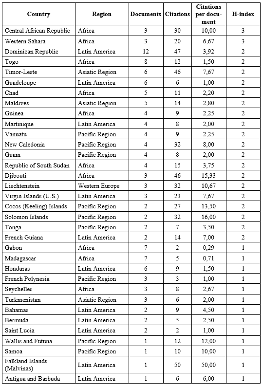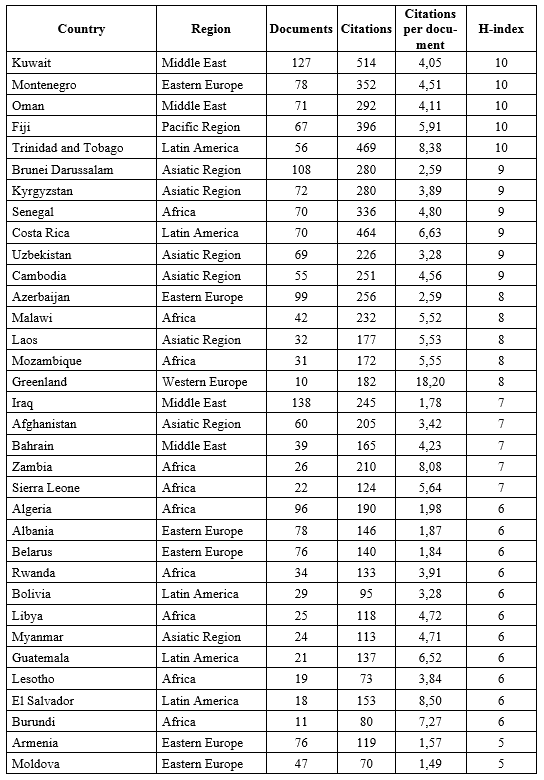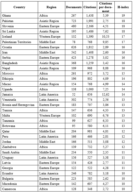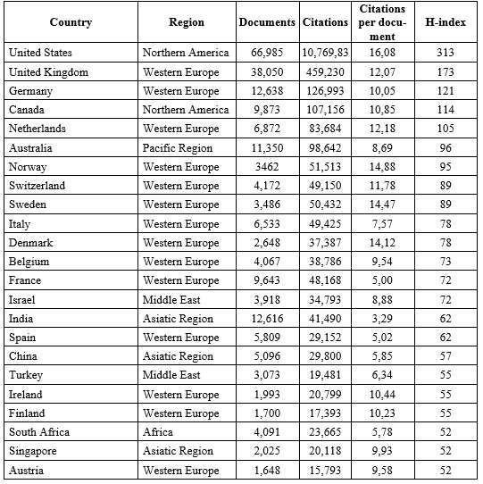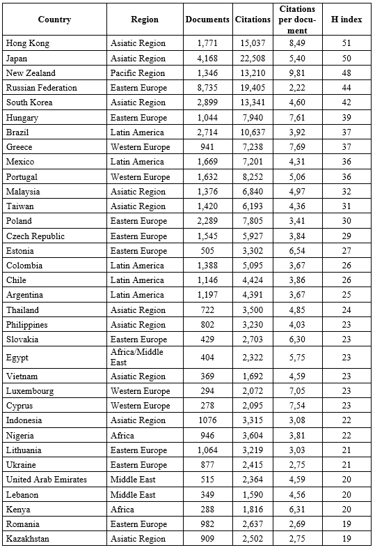 Table 8. The country rankings of the different political science communities in the world according to Scopus, ranked by the H-Index of the country’s political science community (1996–2021)