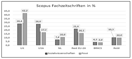 Fig. 1. The localization of the global 7,683 social science and 573 political science journals indexed in the Scopus database in %