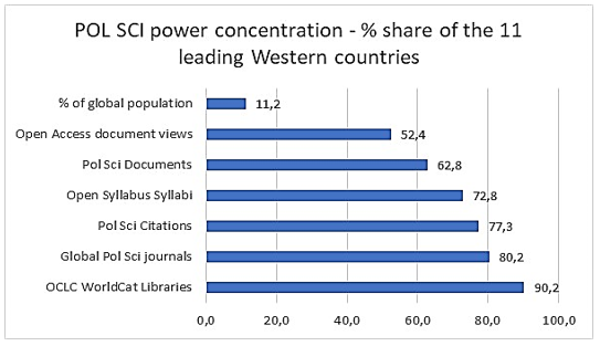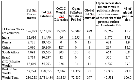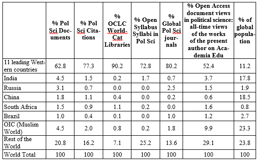 This article also includes a consideration of the centre-periphery system of international political science, based on the Scopus database system and other indicators. We analyze the global output of political science in the international social science journals of all countries indexed in the Scopus system. Unfortunately, we must conclude that the political science communities in the eleven leading Western countries account for no less than 63 % of the political science articles in the world's journals, as well as 77 % of global political science citations. These data are consistent with other perspectives from our analysis. The political science communities in these 11 countries now also account for 73 % of the presence in the Open Syllabus system. The eleven leading countries are the United States, the United Kingdom, Germany, Australia, Canada, France, the Netherlands, Italy, Spain, Switzerland and Japan. In our article, we also compare the presence of these eleven countries with the BRICS countries, the Organization of Islamic Cooperation (the countries of the Muslim world) and the rest of the world. Finally, we use the statistical tool of partial correlation of political science publications per million inhabitants to show the positive impact of political science on indicators of global development, such as gender equality and socio-liberal democratic values.