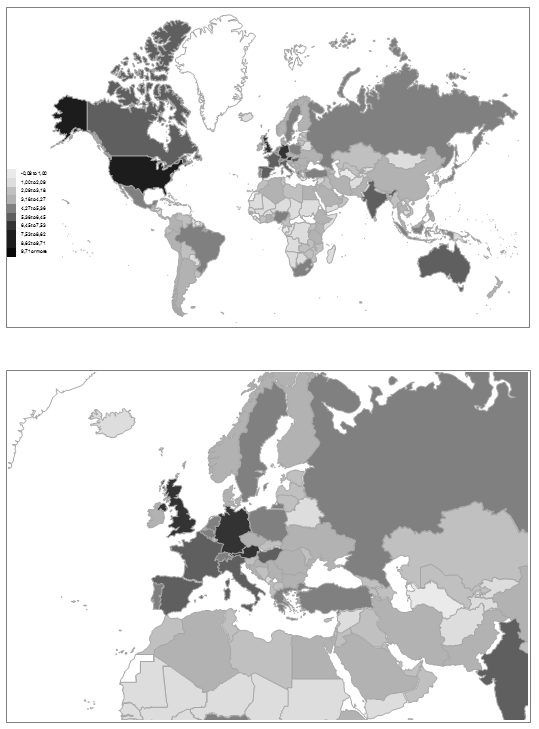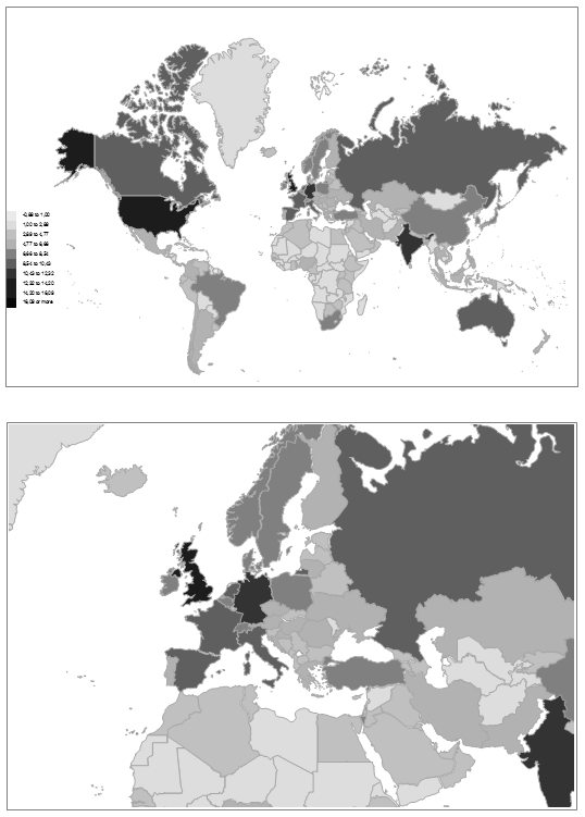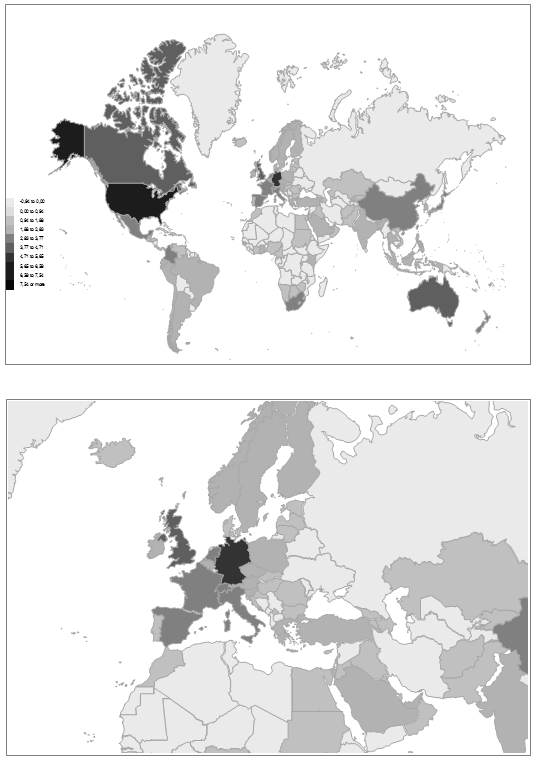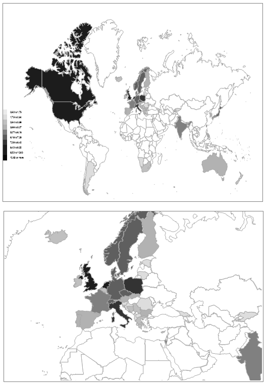 In Table 5 and Figs. 5 and 6, we compare the presence of political science documents with the word ‘political science’ in the title of the document in the libraries around the world. For the aims of this study, we compiled an updated and fairly exhaustive list of 54 national union catalogues, 76 national libraries, 15 parliamentary libraries and nine international organization libraries. Our list expands the list, used by us in earlier research. Only 44 % of the surveyed national union library catalogues, 24 % of the surveyed national libraries, 27 % of the surveyed parliamentary libraries, and two of the nine surveyed international organizations – the OSCE and NATO had library holdings of less than 1,000 titles each with the title word ‘political science’. From this we can risk the dire conclusion that truly vast proportions of the global population and of the surface of our globe do not have a more comprehensive access to standard political science publishing.