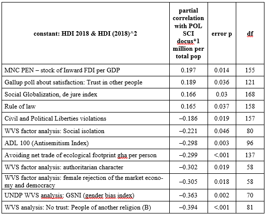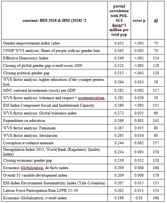 Table 13. What political science does to societies – partial correlation with POL SCI docus* 1 million per total population, the Human Development Index 2018 and its square constant