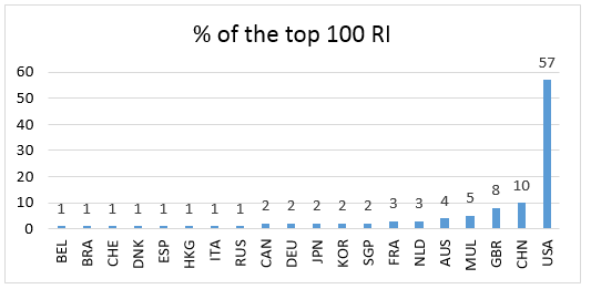 Fig. 7. Country distribution of 100 leading research institutes and universities (RI) worldwide
