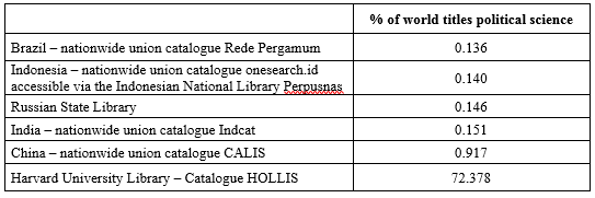 Table 3. Holdings of works with the title ‘political science’ in the library catalogues of the BRIIC countries as a % of the 474,974 global titles available in OCLC WorldCat
