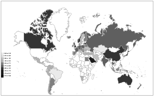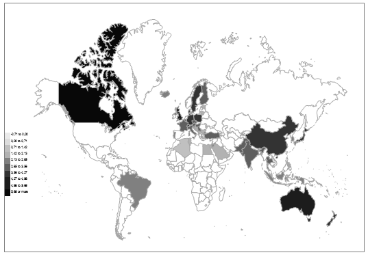 Fig. 9. Choropleth map of the publication of global political science documents (^0,25) per country