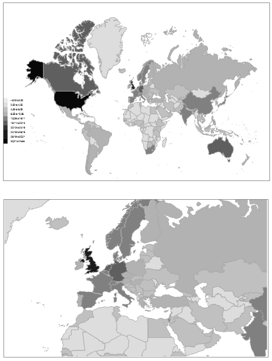 Fig. 14. Open access figures for the present author (^0.25) (All-Time Views of his files on Academia Edu) as an indicator of how even open access political science is characterized by global inequality