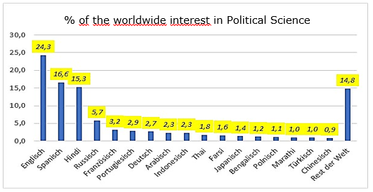 Let us dive further down into the real-world potential markets for information and science on our planet. Fig. 4 indicates the dramatic need for political science information in Hindi, Russian, Portuguese, Arabic, and Indonesian, language communities which all share over 2 % each of the roughly estimated global interest in political science based on Wikipedia downloads. These language communities, along with English, the ever-emerging Spanish, and German, still a powerful communication tool in global political science, will become the superstars of the coming decade of global political science.