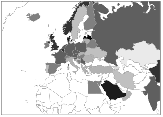 Fig. 10. Published political science documents per 1 million population (^0,25)