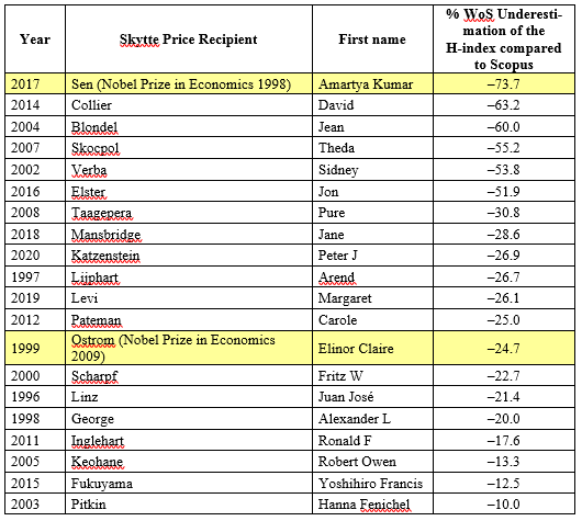 Also truly disastrous in its effects on the system of science is the underestimation of the scientific achievements of individual members of the scientific community that can be observed in Clarivate's WoS compared to the very reliable Elsevier's Scopus, in this case of several Skytte Prize winners, including two Nobel Prize winners in economics.