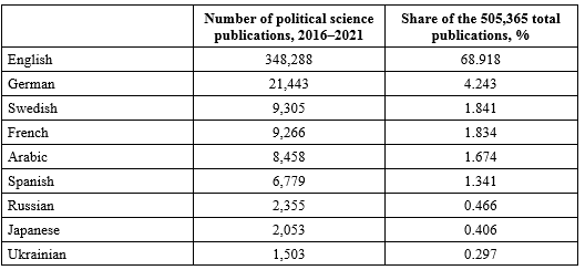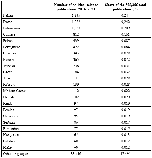 Table 2. The global distribution of recent political science publications, 2016–2021 by language of publication in %